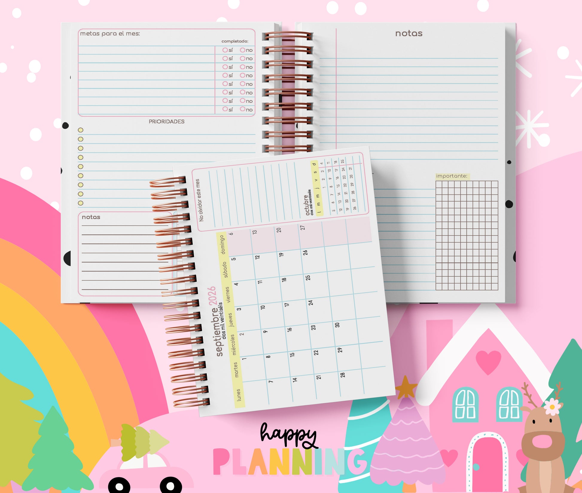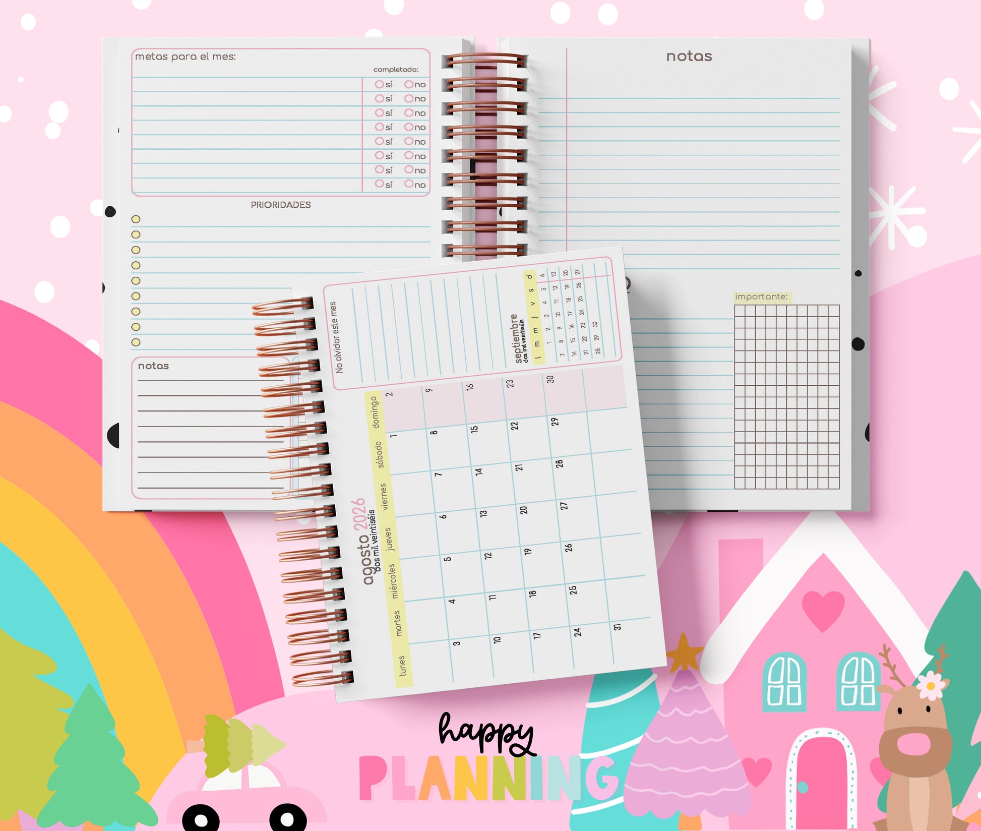 Metas del año, finanzas mensuales, fechas importantes, contraseñas, contactos y notas. Además, incluye 9 portadas + contraportadas para personalizar tu planner.