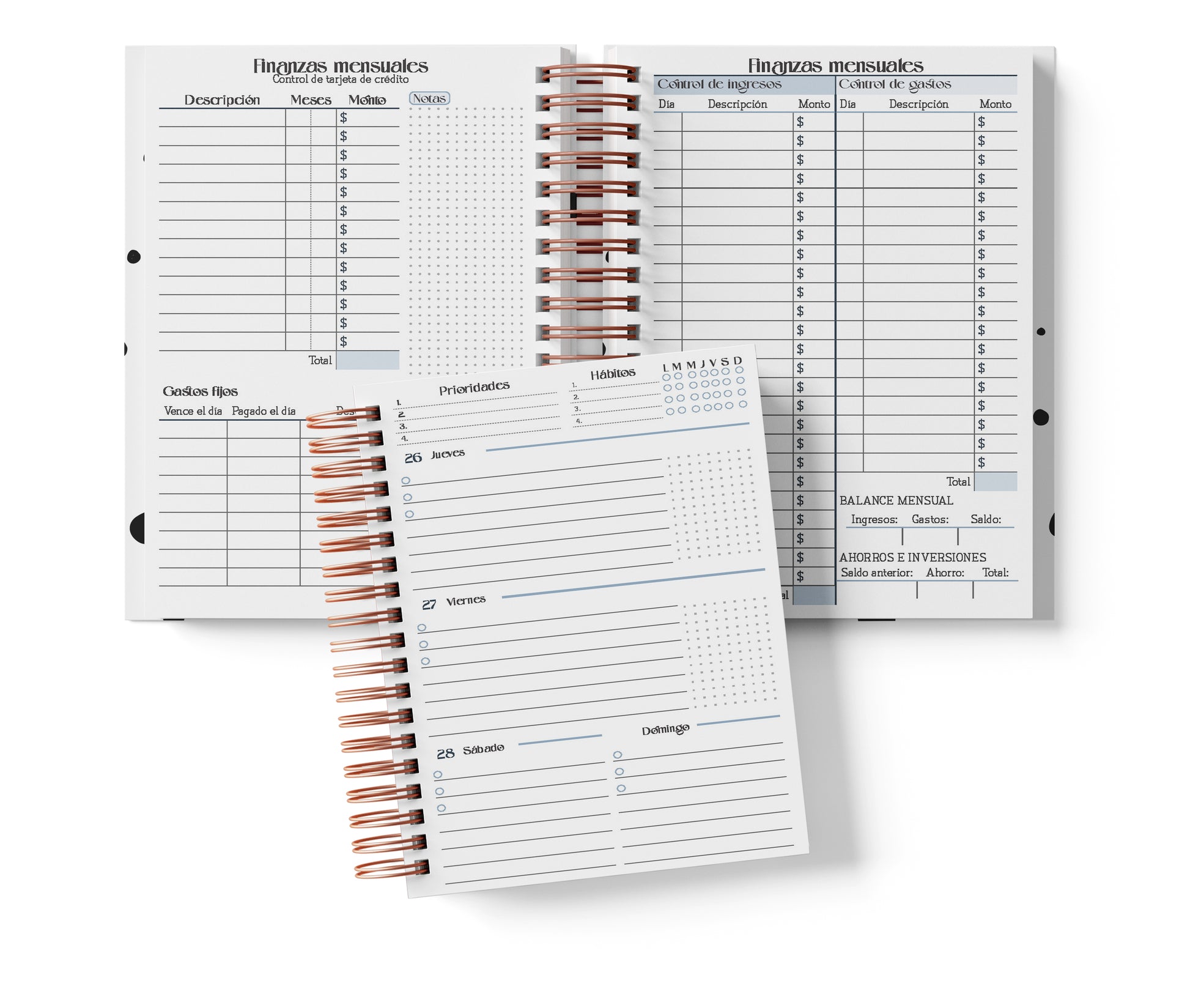 Semana en formato horizontal: espacios amplios por día para notas, prioridades y control de hábitos, con toda la organización personal alineada de izquierda a derecha.