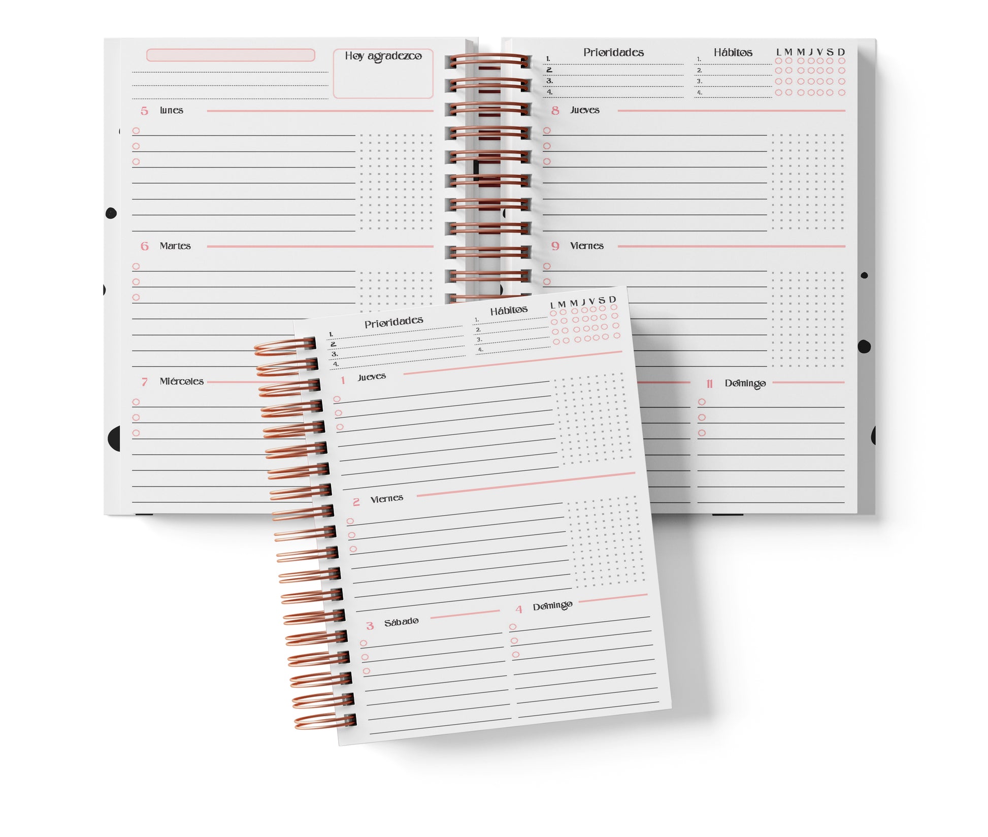 Más productividad gracias a una agenda semanal minimalista con vista horizontal que separa prioridades de pendientes.