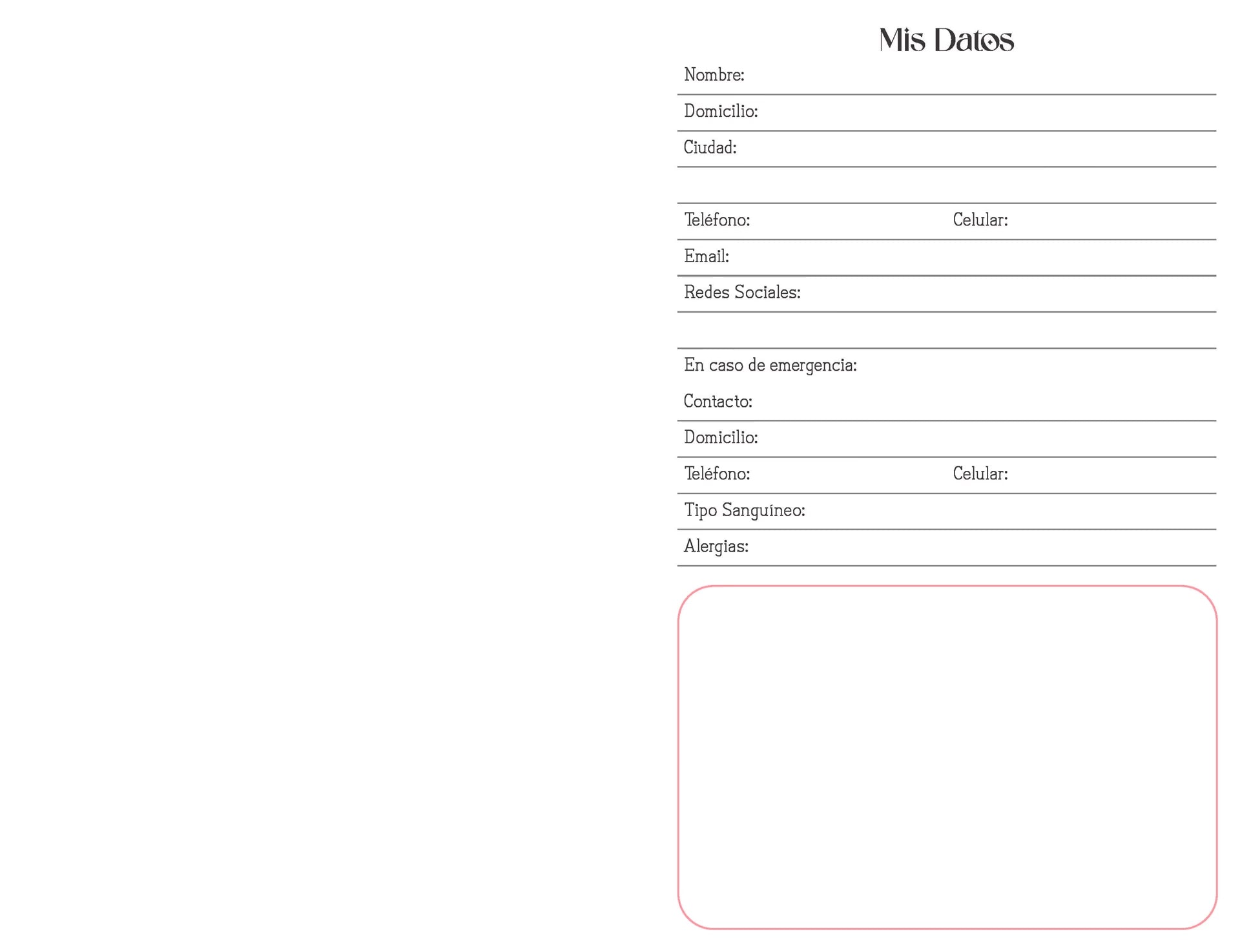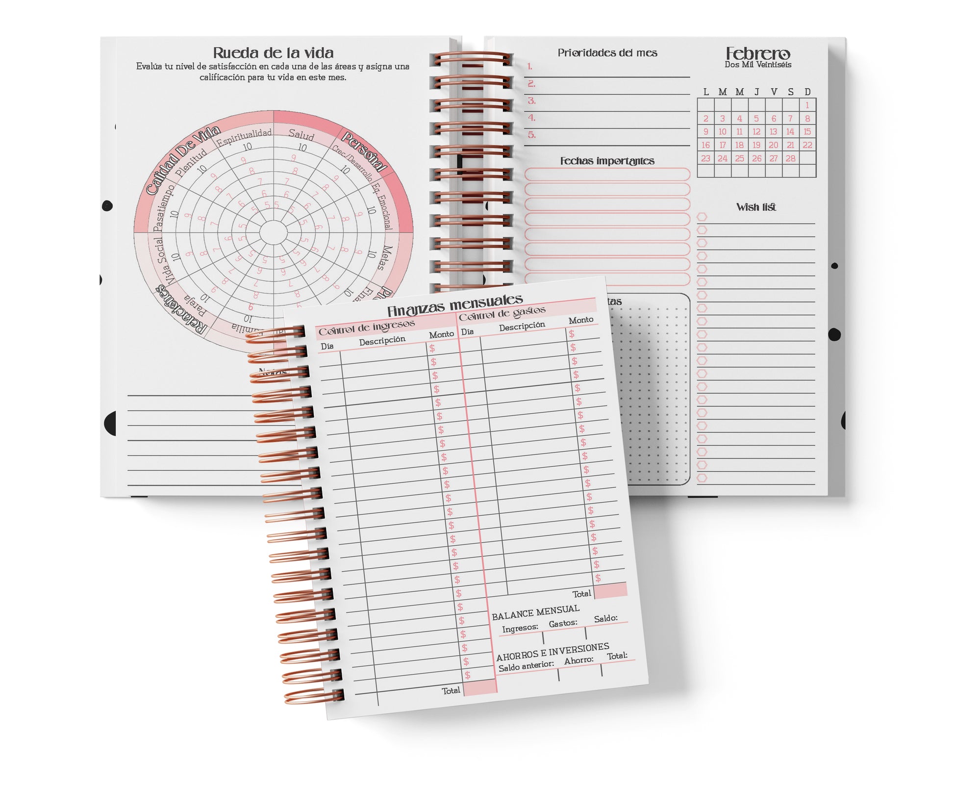Contenido del PDF: datos generales; calendarios 2026 y 2027; planeación anual; mi año en píxeles; control de salud; visión financiera anual; contraseñas; seguimiento de lecturas, series favoritas y viajes; calendarios mensuales; agenda semanal en formato horizontal; finanzas mensuales; rueda de la vida; sección de notas.