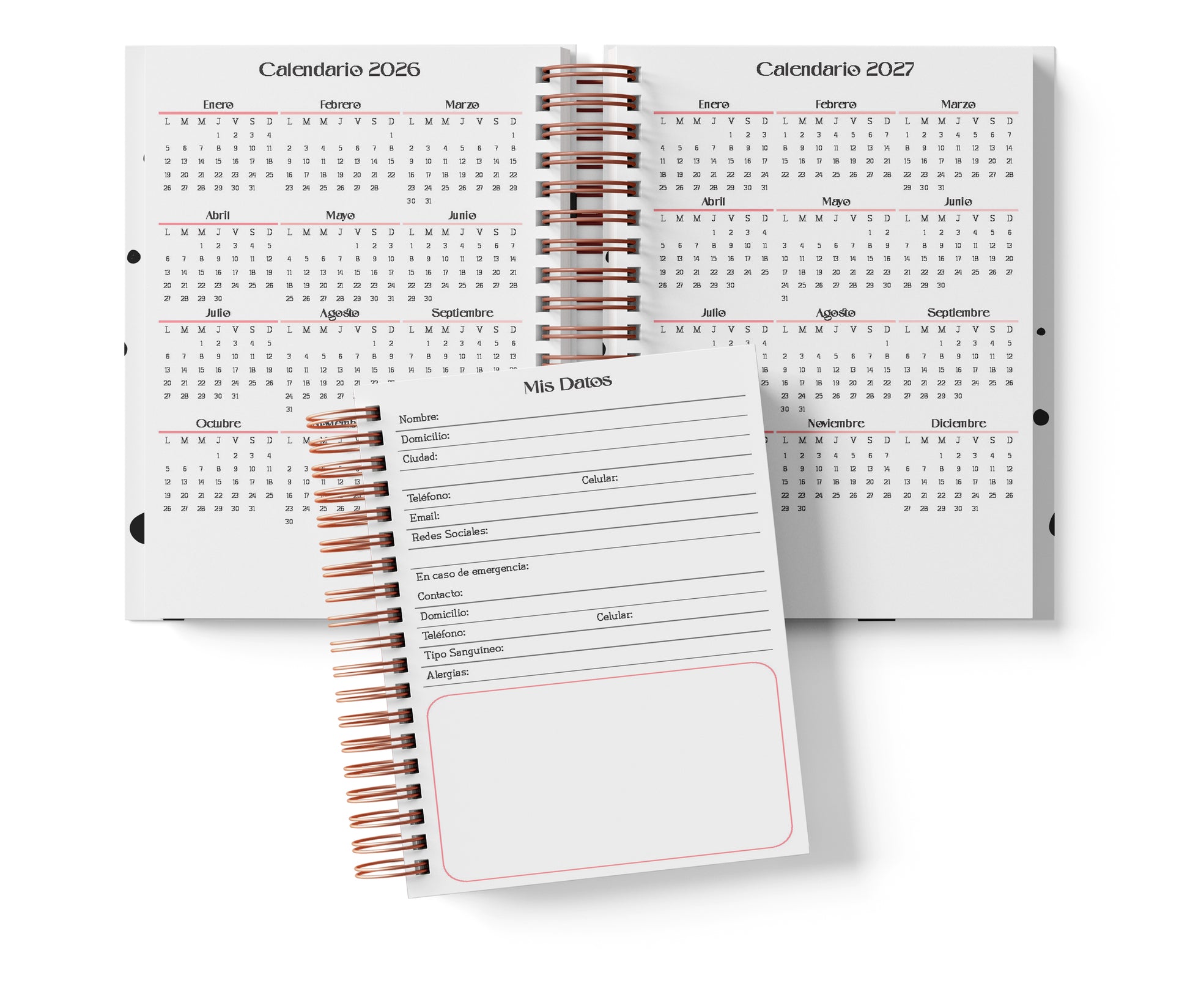Visión anual y mensual completa: calendarios 2026 y 2027, calendario mensual y planeación anual para alinear metas con fechas clave.