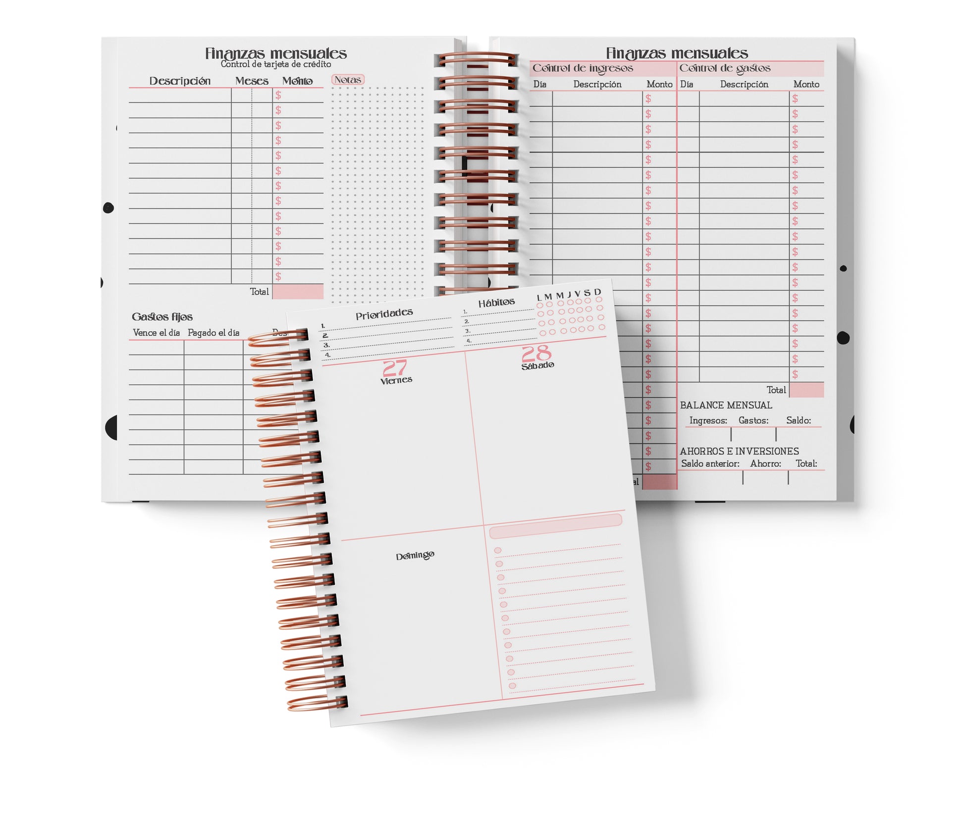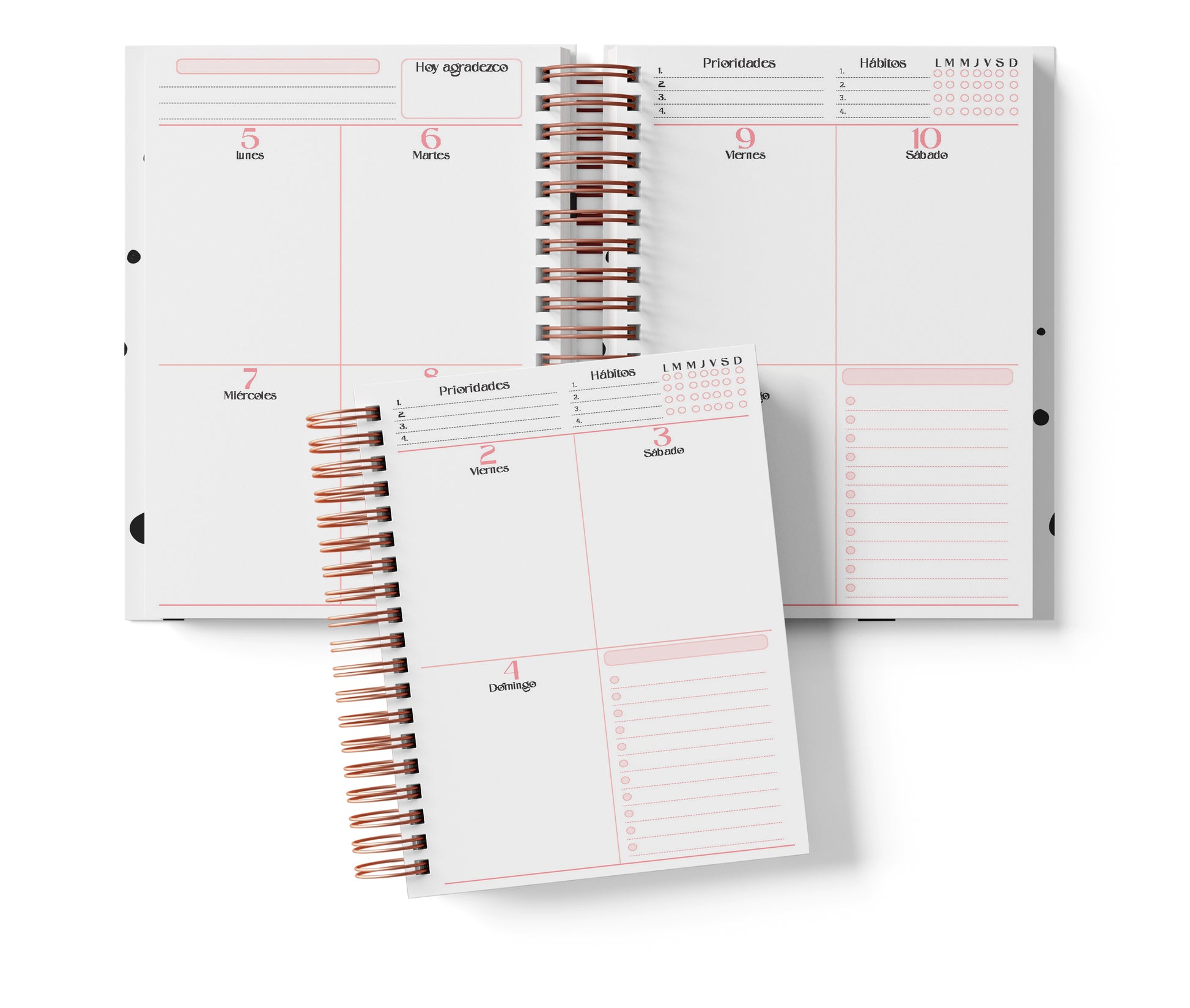 Planificación semanal centrada en lo importante: espacios para prioridades, listas y control de hábitos que te ayudan a cumplir metas reales, no solo a anotar tareas.